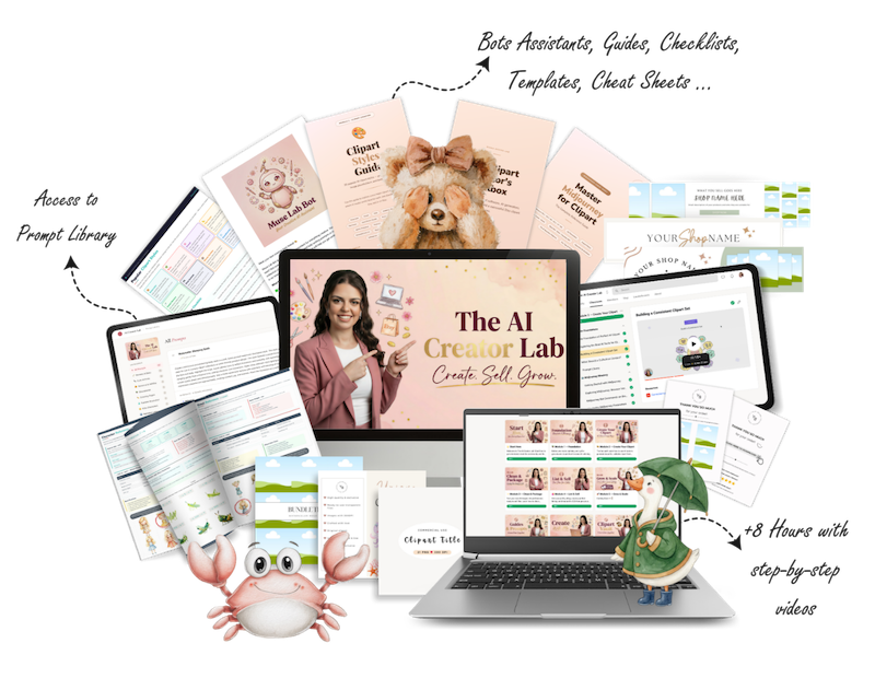 Most people find me through my clipart shop but the Lab is bigger than that. If you create any kind of digital product and you want to use AI to make better graphics, sell more and stop guessing, this is for you.